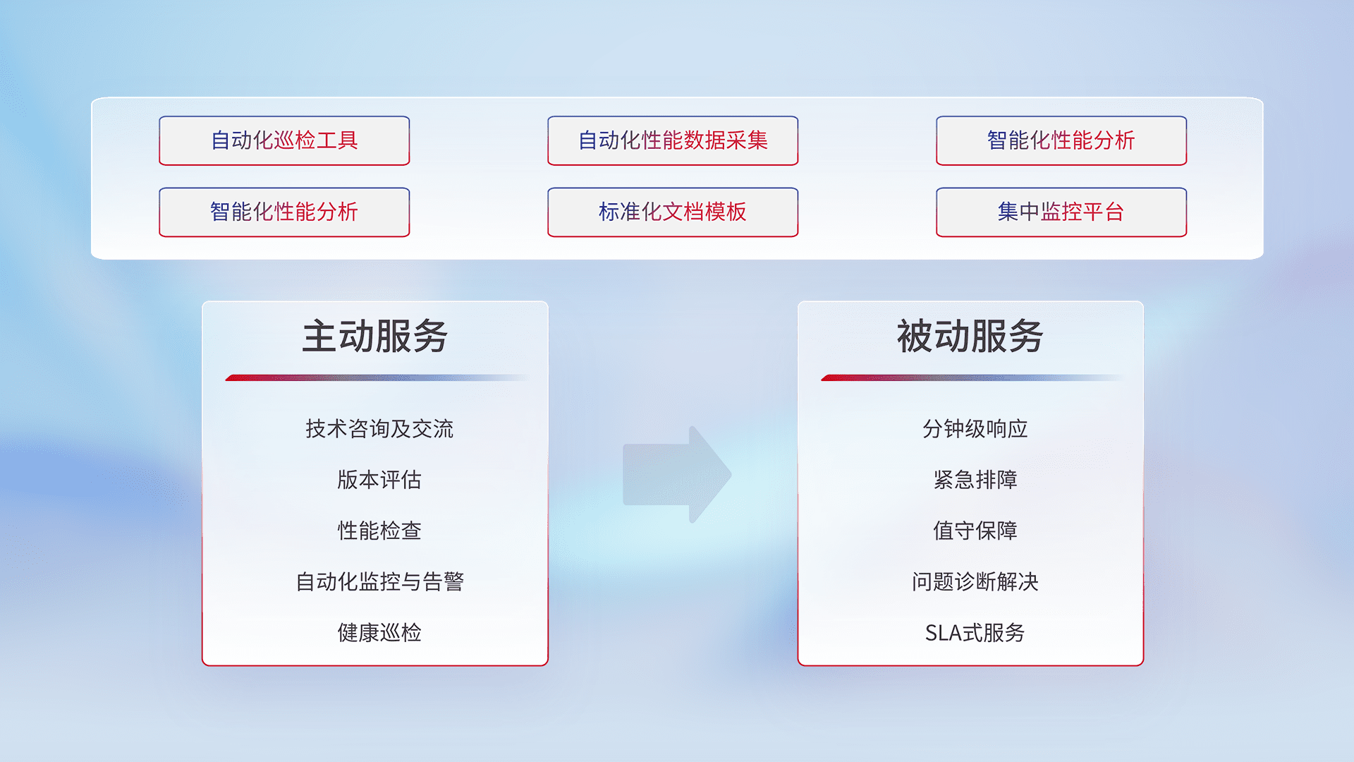 智能化工具和标准化文档,,,保障服务质量,,,提供主动服务(包含技术咨询、、版本评估、、、性能检查、、、自动化监控与告警、、、、健康巡检)和被动服务包含(分钟级响应、、紧急排障、、、、值守保障、、问题诊断解决、、SLA服务)。。。。